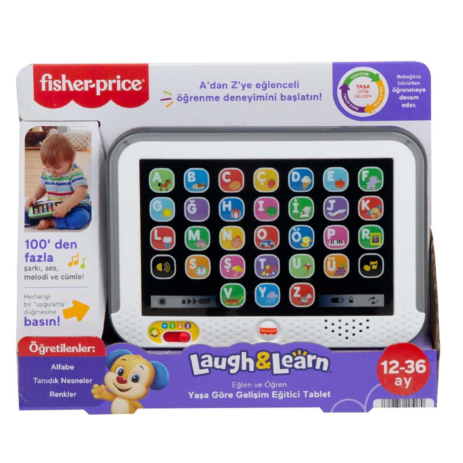 Fisher-Price® Eğlen ve Öğren Yaşa Göre Gelişim Eğitici Tablet, çocuğunuz için tasarlanmış etkileşimli bir oyuncak tablettir. Bu elektronik eğitici oyuncakta, çok renkli ışıklar ve harfler ile hayvanlar gibi miniğinize ilk kelimelerini öğretecek 100'den fazla şarkı, ses ve ifadeyi etkinleştiren 28 'uygulama' düğmesi bulunur. Yaşa Göre Gelişim teknolojisinin 3 farklı seviyesiyle çocuğunuzun gelişimine uygun olan oynayarak öğrenme aşamasına geçebilirsiniz. 100'den fazla şarkı, ses ve ifade içeren, rengarenk ışıklı, elektronik, eğitici oyuncak tablet! Alfabeyi, aşina oldukları nesneleri ve renkleri Türkçe tanıtarak bebeğinizin gelişim adımlarına uyum sağlayan 3 Yaşa Göre Gelişim seviyesi. Basıldığında şarkılar ve sesler etkinleşen 28 'uygulama' düğmesi. Bu oyuncak, bebekler ve 1-3 yaş arası çocukların ince motor becerilerini güçlendirmeye yardımcı olur, sebep ve sonuç ilişkisini öğretir ve çocukları erken yaşta canlandırma oyunları oynamaya teşvik eder.