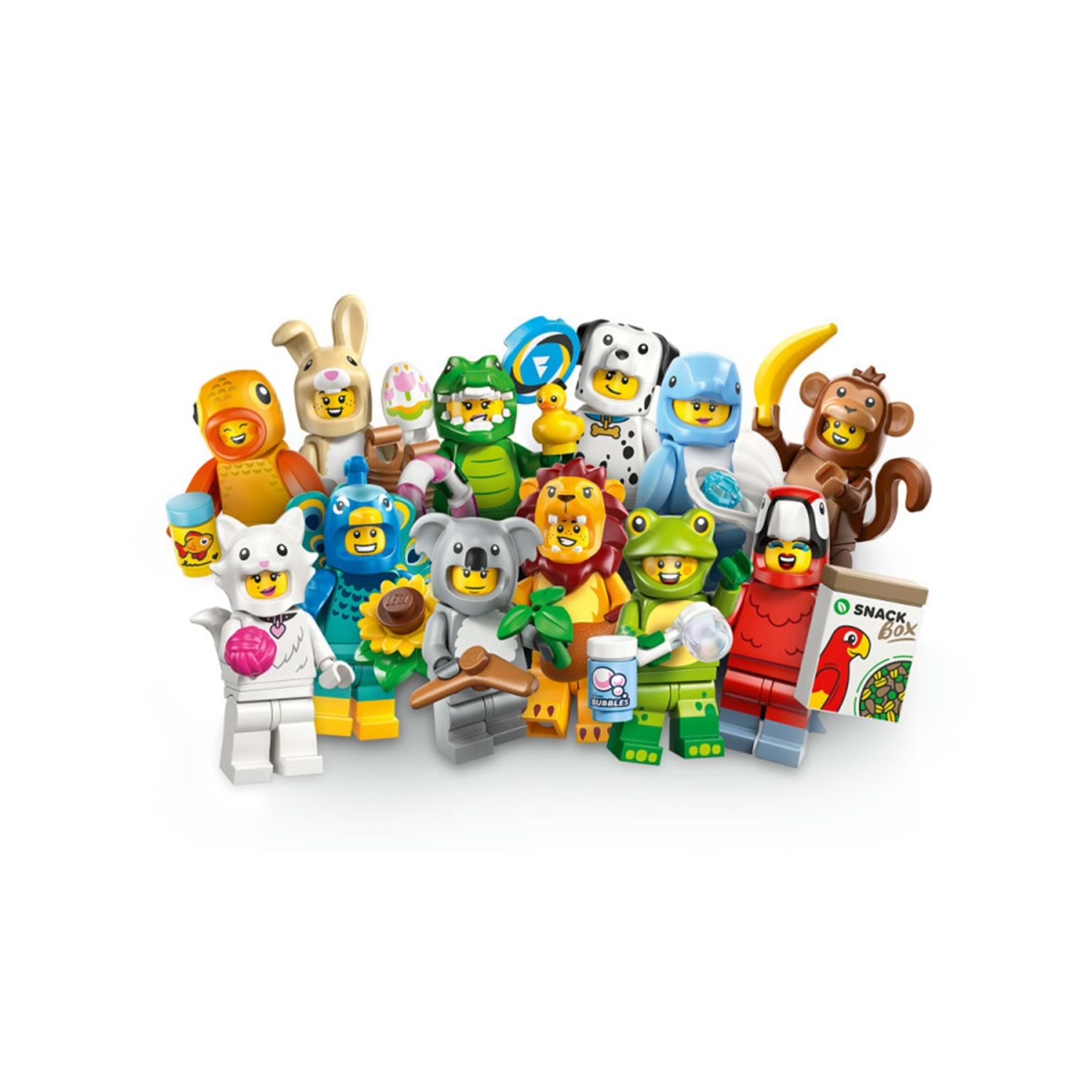 12 OYUNCAK HAYVANDAN BİRİNE SAHİP OLUN – Çocuklar; aslan, kurbağa, timsah, maymun, koala, papağan, köpek, sevimli tavşan, Japon balığı, tüylü kedi, tavus kuşu ve yunus kostümleri giymiş minifigürler dahil her kutuda 12 koleksiyonluk oyuncaktan birine sahip olmanın keyfini çıkarabilir.